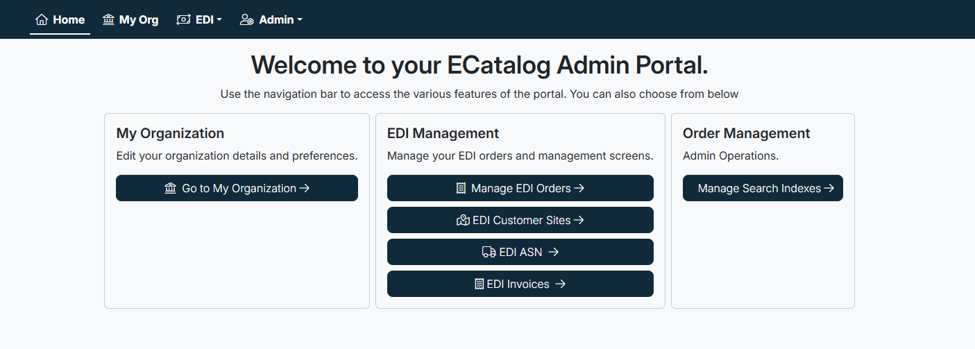 The Dashboard is the first page you see after signing in to the eCatalog Administration Portal. It provides a central entry point to the main administrative functions, allowing you to quickly access organizational settings, manage EDI transactions, and perform order-related operations.