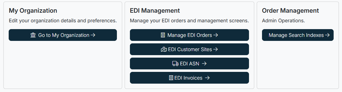 - EDI Management → View and manage EDI orders, customer site associations, and advanced shipping notices (ASNs).