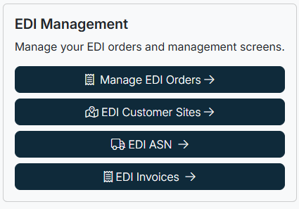 The EDI module provides a centralized platform for managing all electronic transactions between your organization and its customers. It ensures accuracy, efficiency, and visibility across the full order-to-cash process. The module is divided into four key areas: