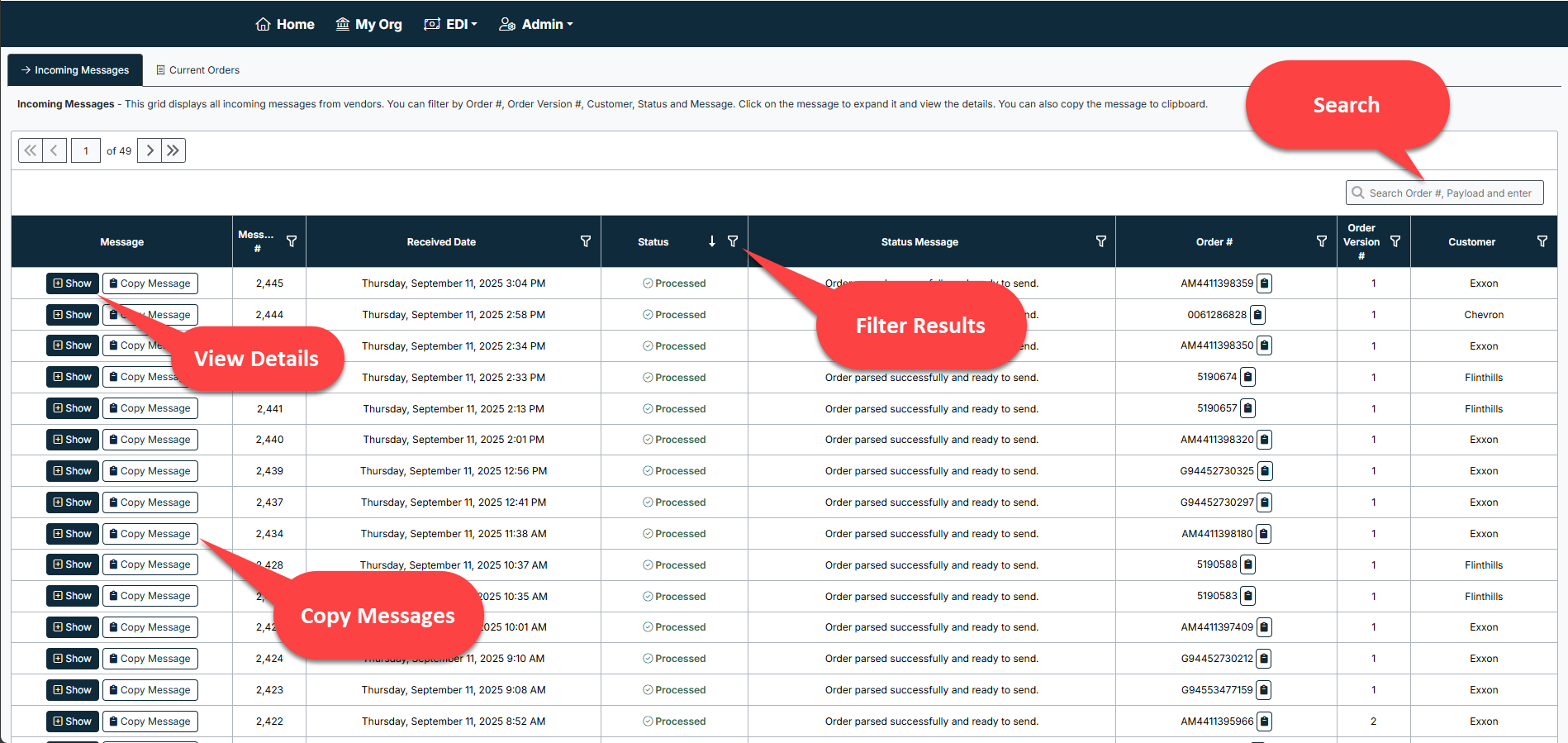 - Copy messages → click Copy Message to copy raw EDI message content for troubleshooting or audits.