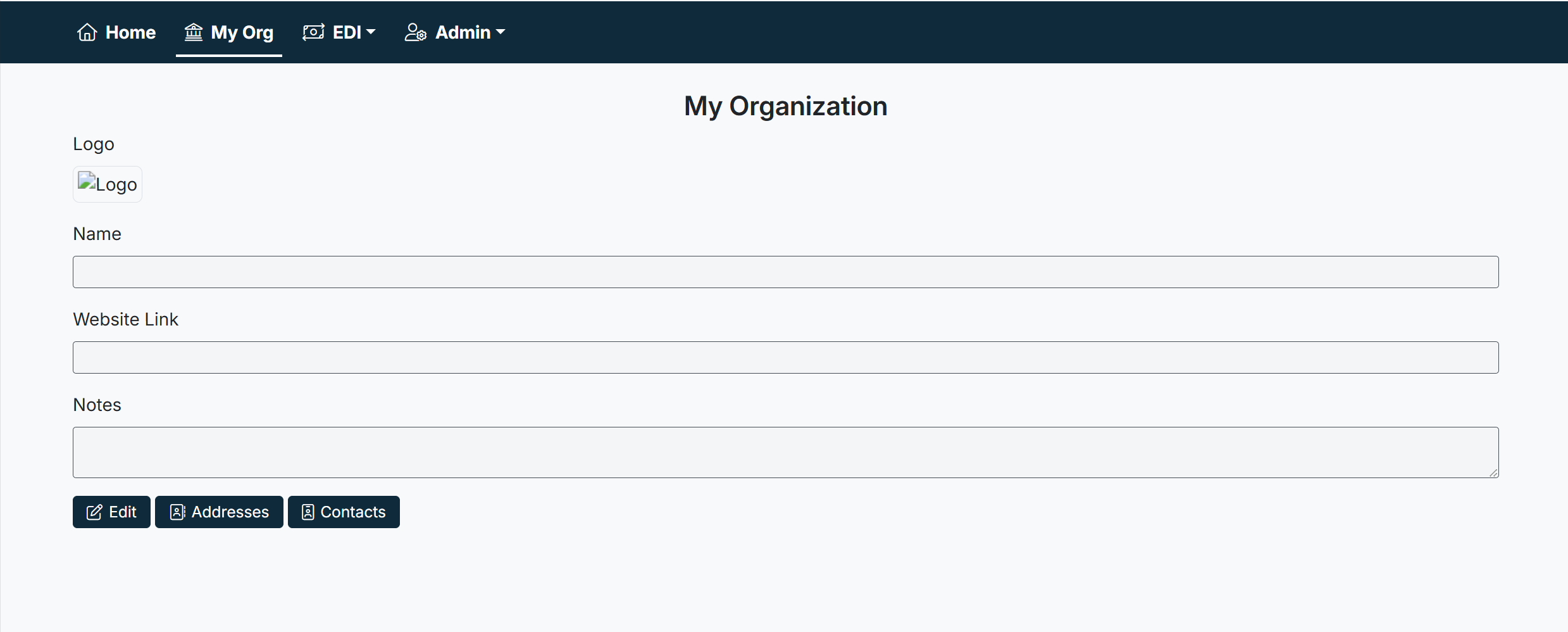 - The My Organization screen will display, showing editable fields and management options.